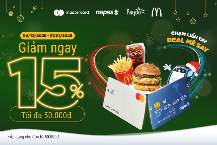 - Giảm 15%, tối đa 50.000đ cho hóa đơn từ 100.000đ.