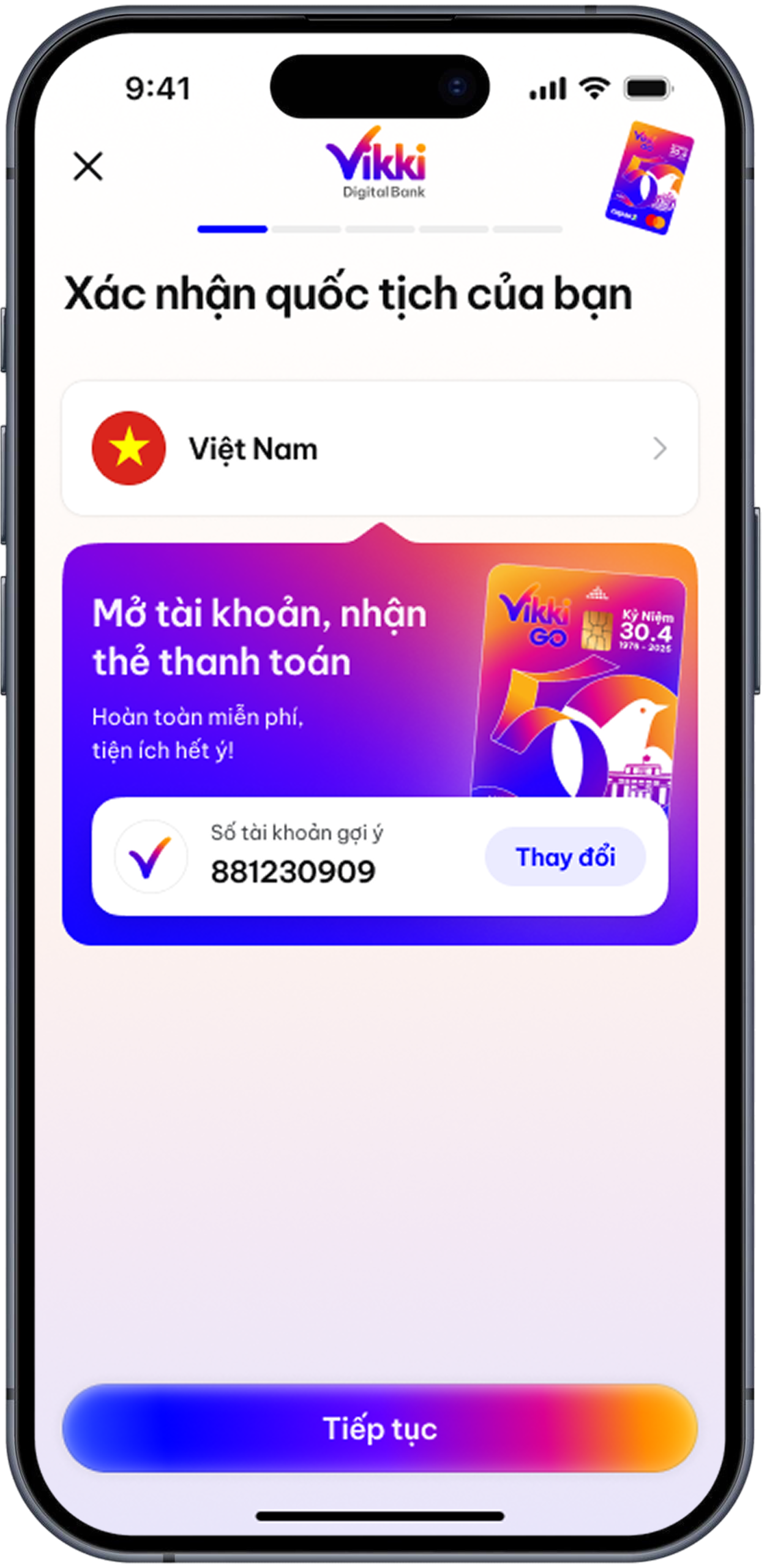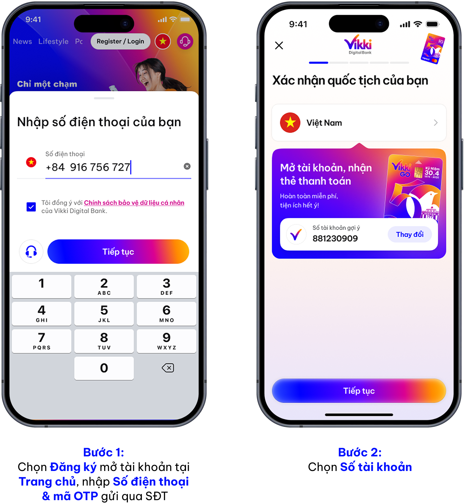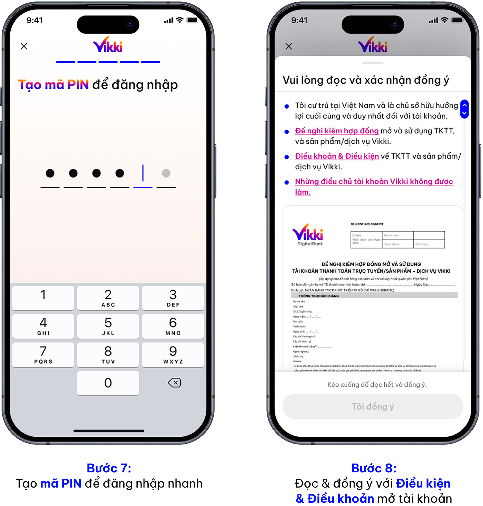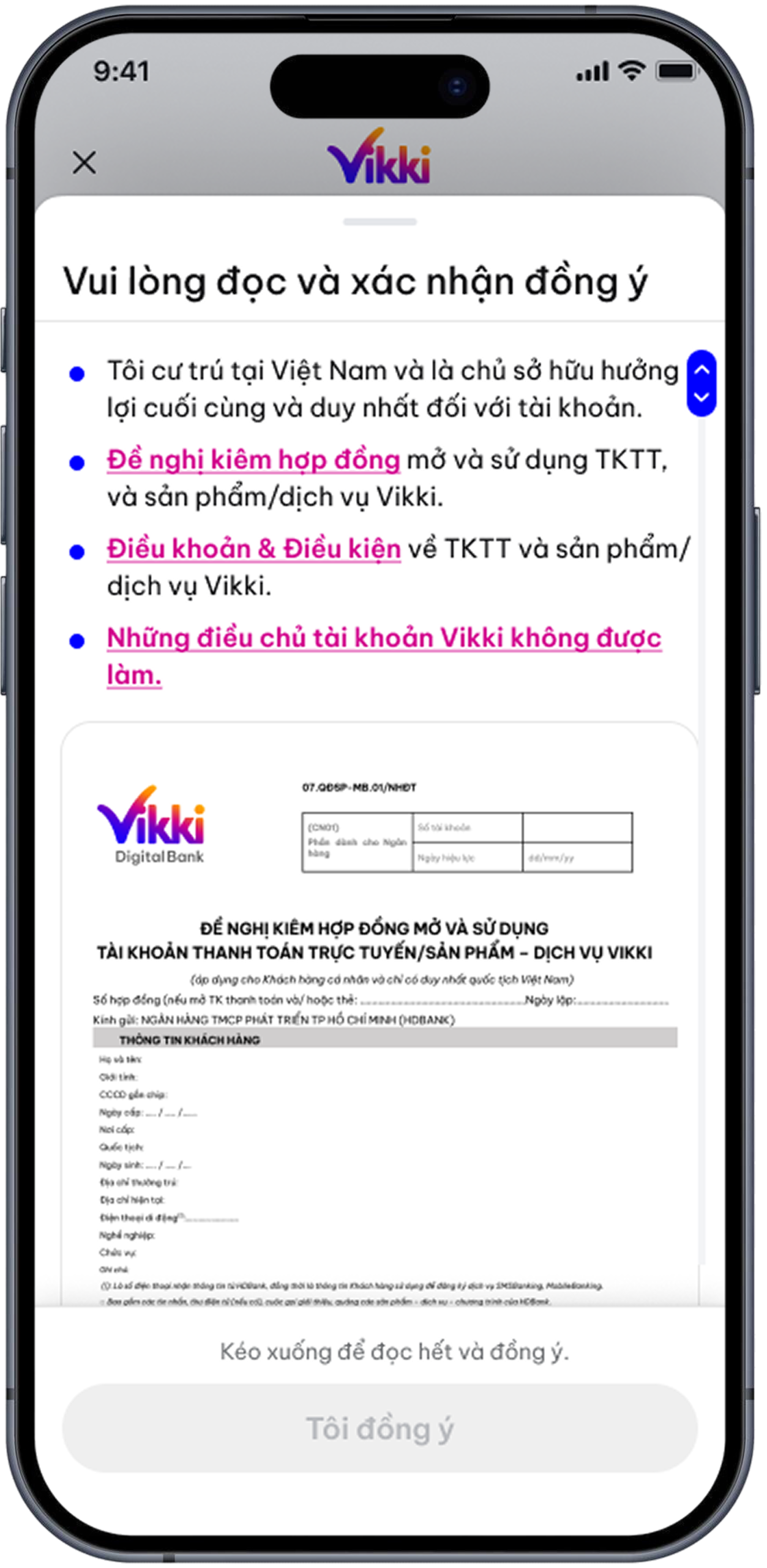 - Chọn Vikki Bank, đồng ý với Điều khoản và bấm Tiếp tục.