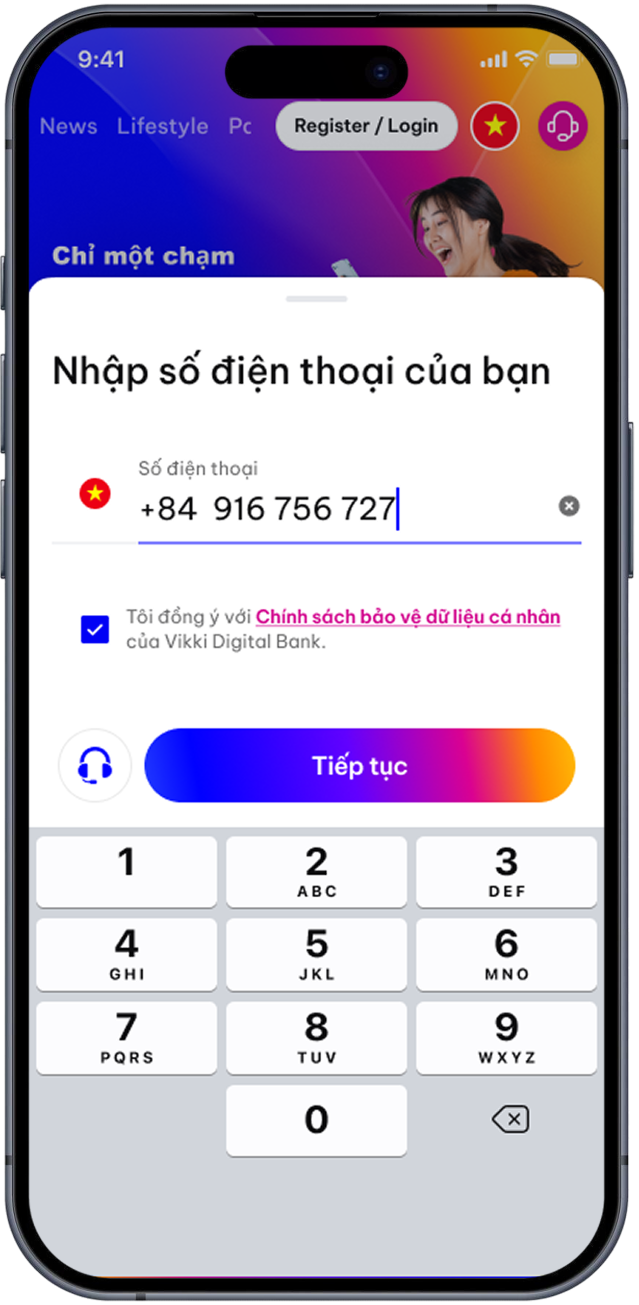 Chọn Đăng ký mở tài khoản tại Trang chủ, nhập Số điện thoại & mã OTP gửi qua SĐT