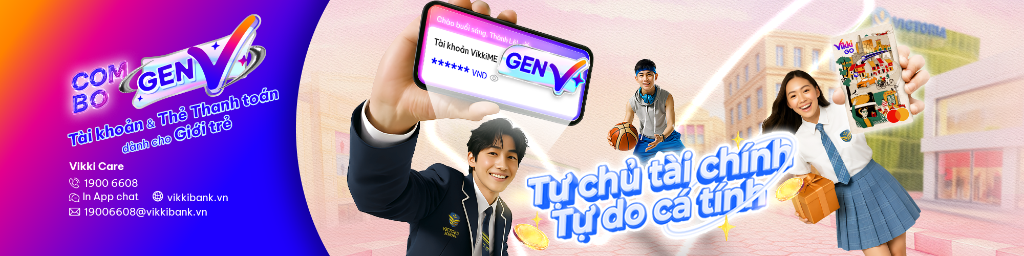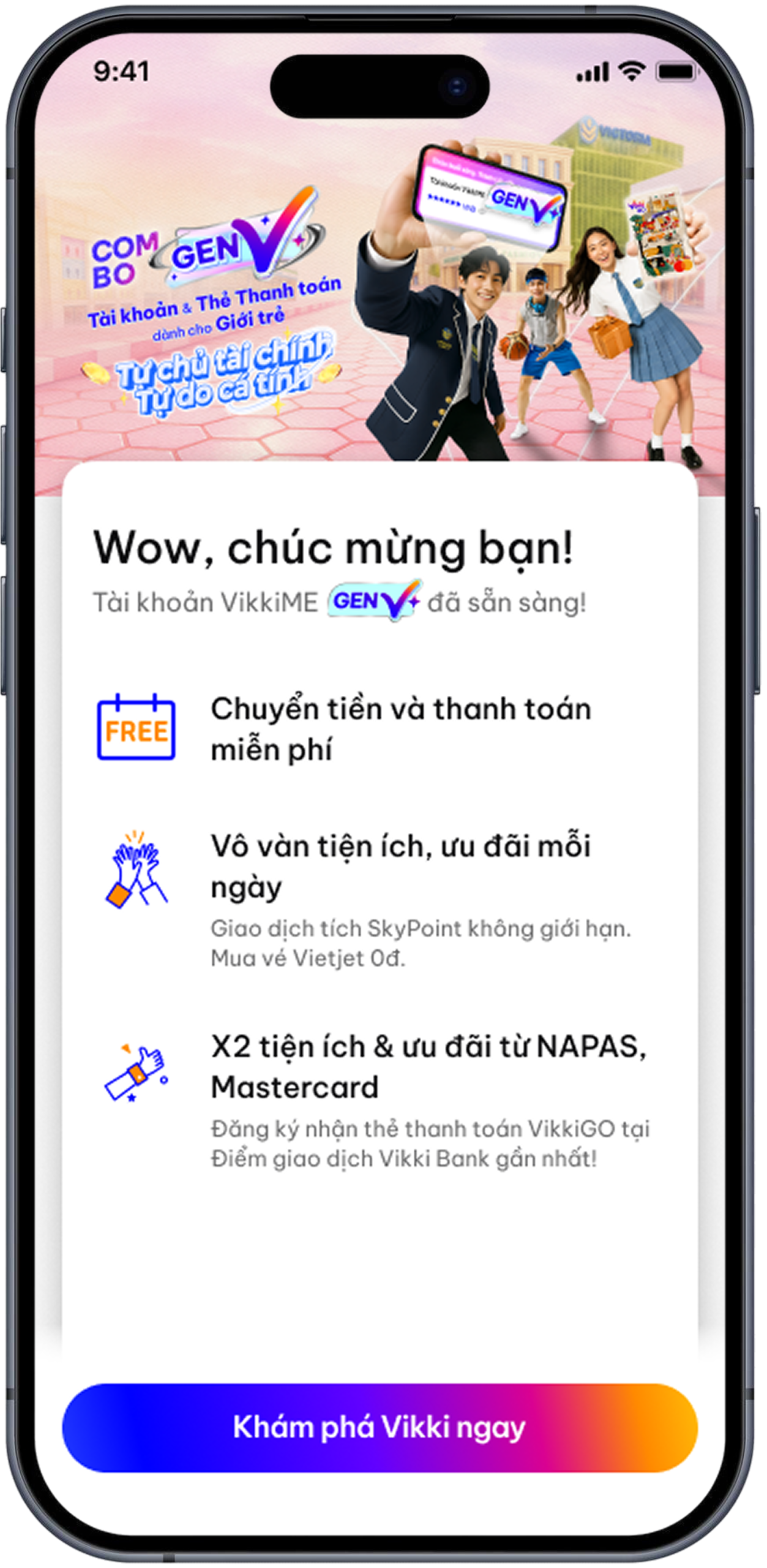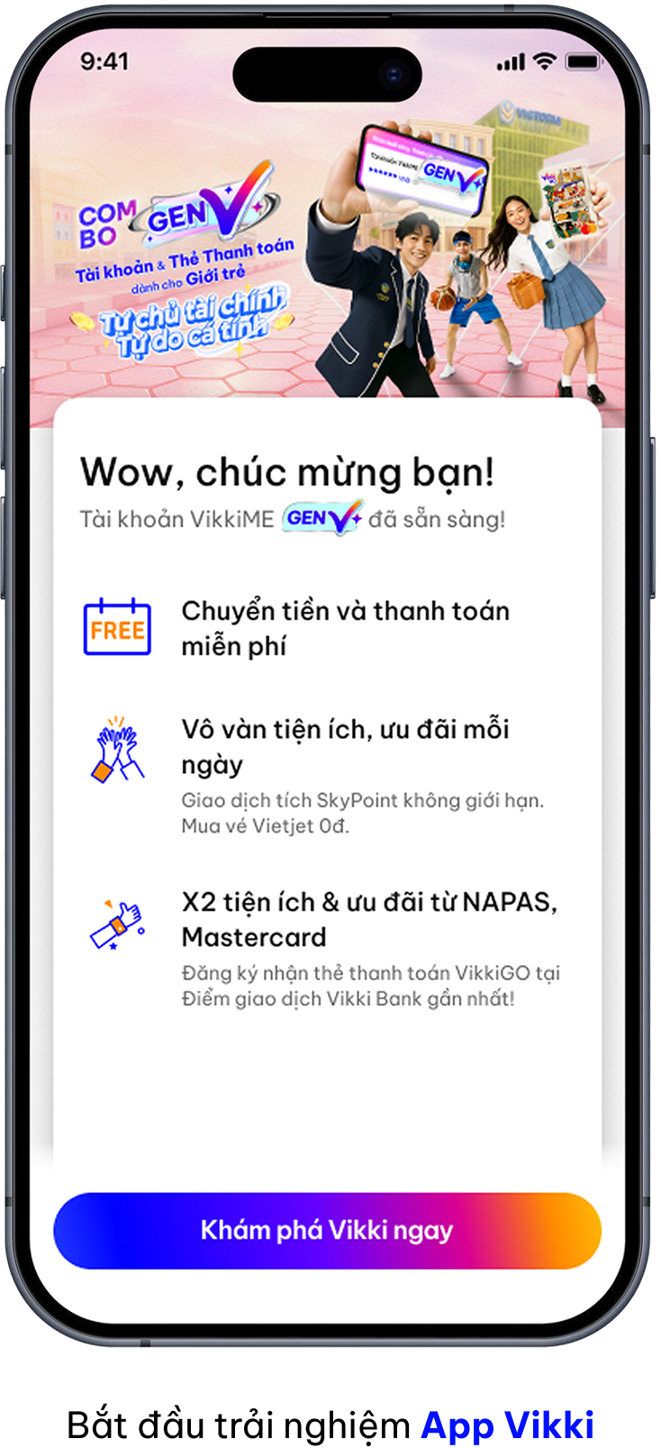 Tài khoản VikkiME GenV mang đến cho bạn rất nhiều lợi ích, được thiết kế riêng cho khách hàng từ đủ 15 tuổi đến dưới 18 tuổi, giúp bạn làm chủ tài chính sớm trong môi trường an toàn và hiện đại như: