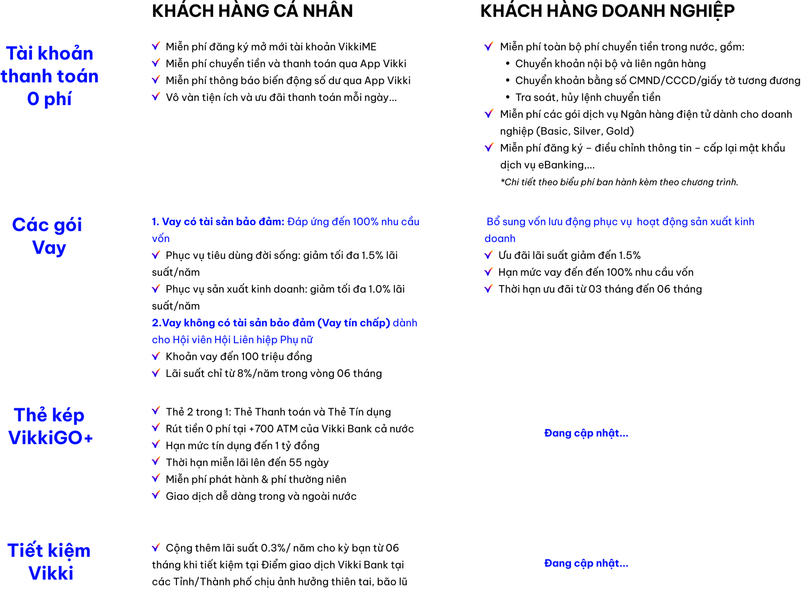 Hòa chung tinh thần “tương thân tương ái”, đồng hành cùng Khách hàng Doanh nghiệp và Khách hàng Cá nhân tại các tỉnh, thành bị ảnh hưởng thiên tai, bão lũ, Ngân hàng TNHH MTV Số Vikki triển khai chương trình ưu đãi với Tài khoản Thanh toán 0 phí, các gói Vay có Tài sản bảo đảm (TSBĐ) và không có Tài sản bảo đảm, Thẻ kép VikkiGO+, Tiết kiệm Vikki nhằm hỗ trợ khách hàng phục hồi, tiếp tục phát triển.