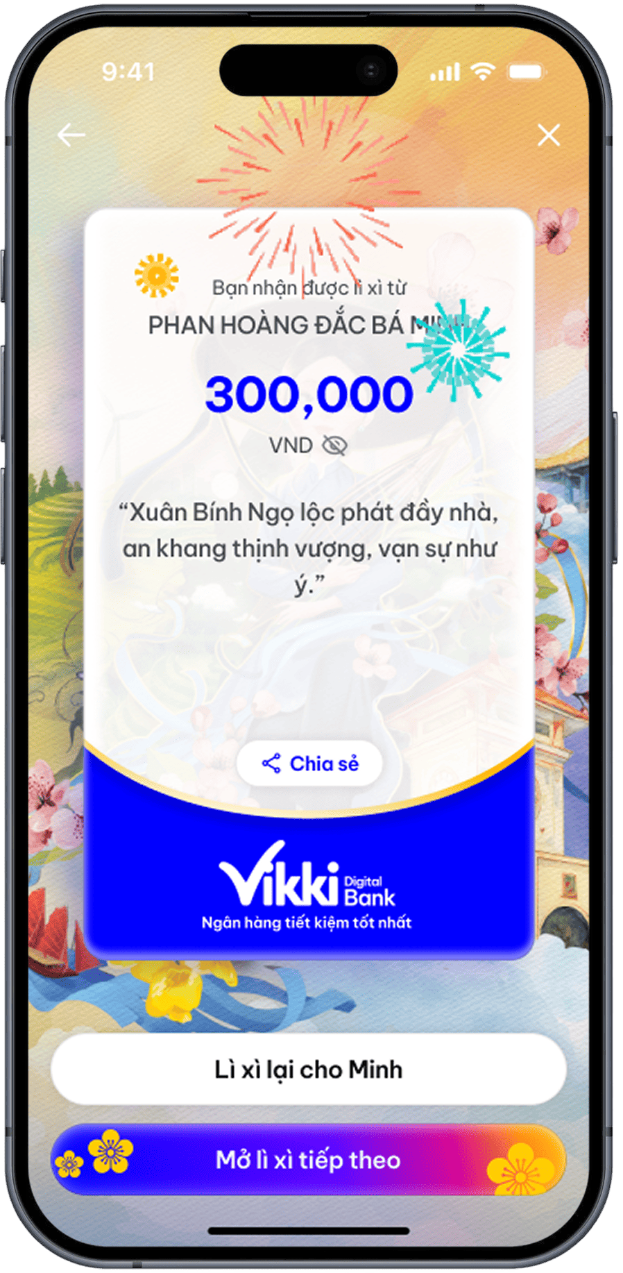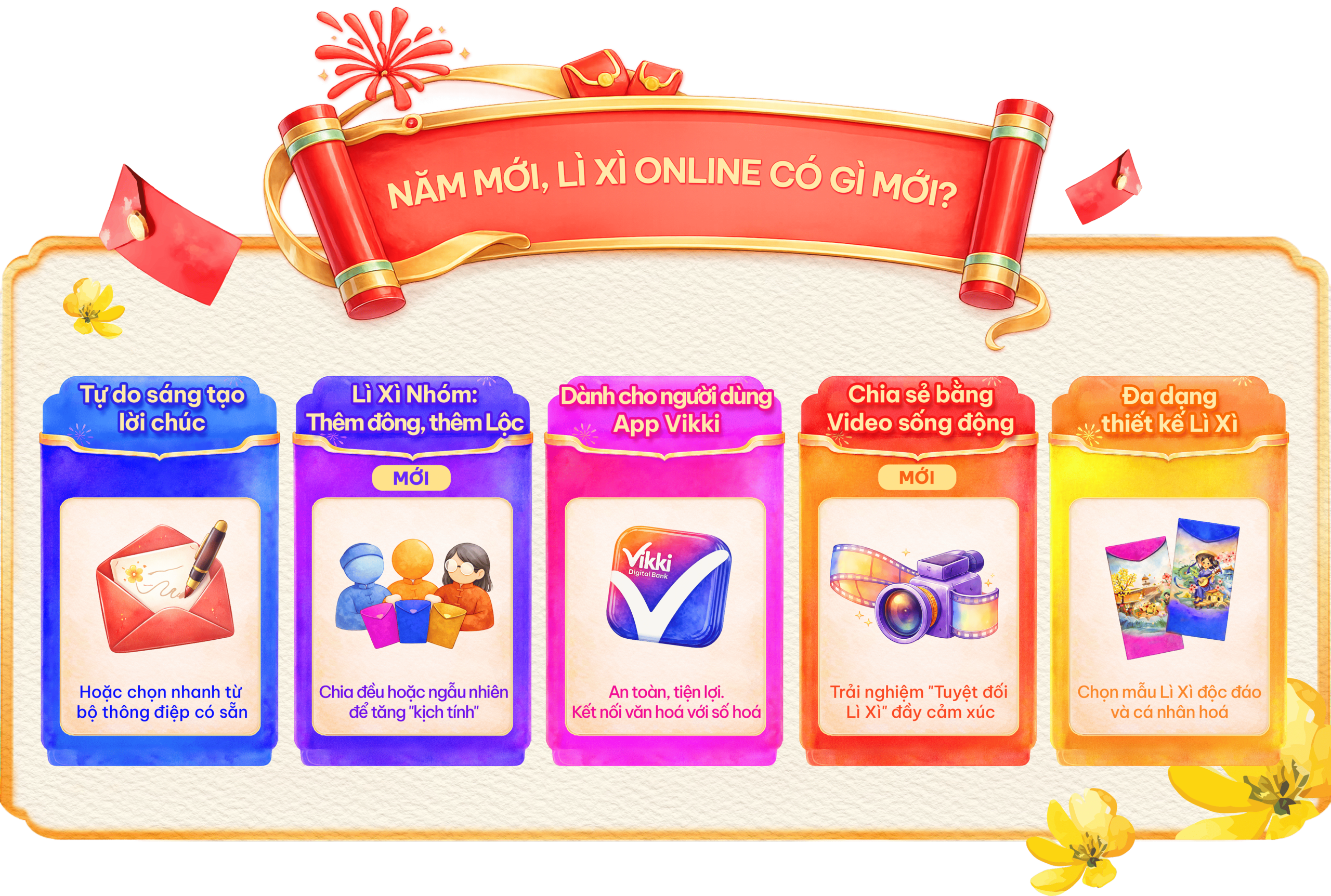 Lì Xì Online chính thức quay trở lại trên App Vikki với diện mạo mới, hiện đại và tiện lợi hơn. Vẫn là phong bao đầu năm mang lời chúc may mắn quen thuộc, nay được nâng cấp thêm nhiều tính năng mới, bắt nhịp Tết Số – để mỗi lượt lì xì không chỉ là trao lộc đầu năm, mà còn là khoảnh khắc gắn kết đầy cảm xúc.