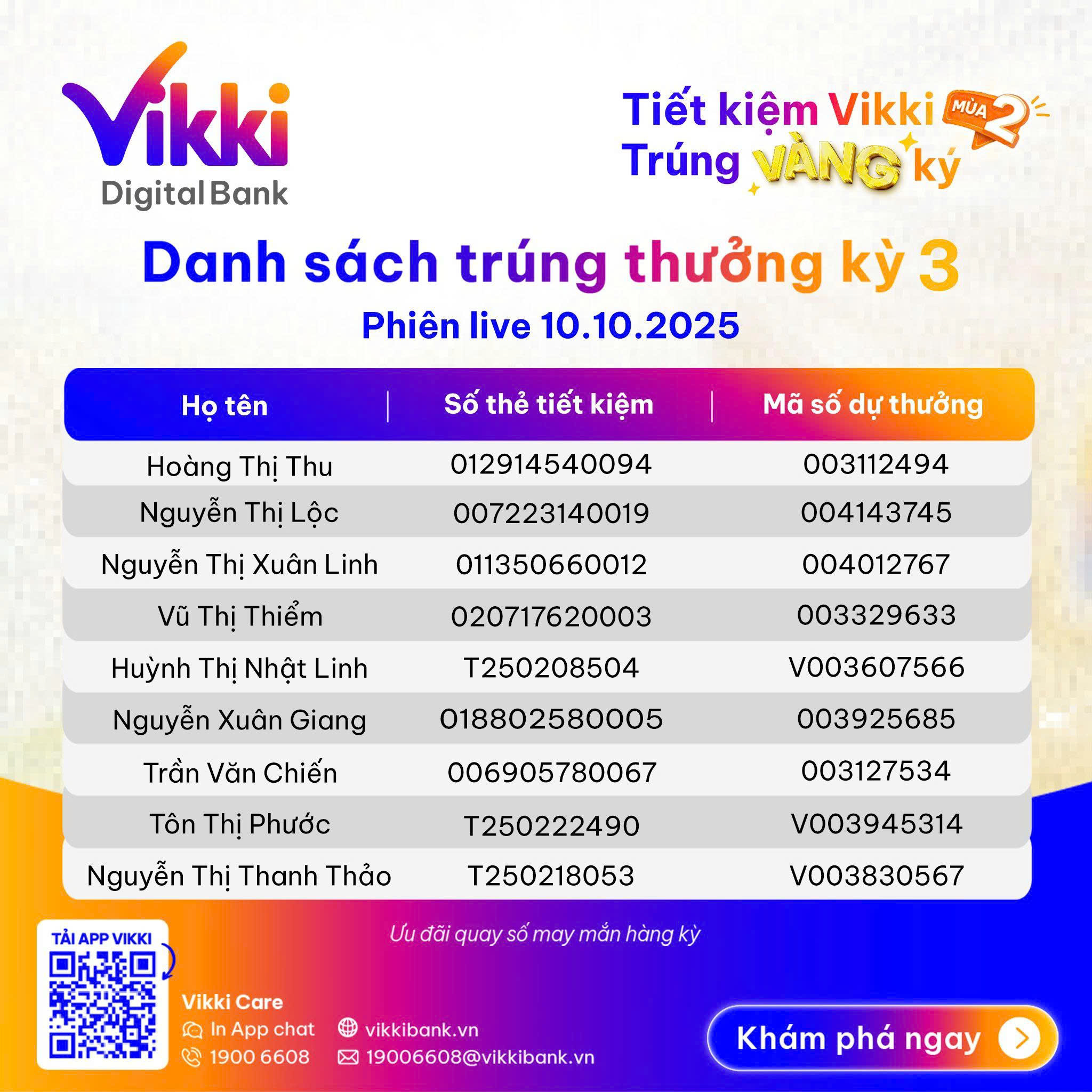Tổng giá trị giải thưởng và quà tặng của “Tiết kiệm Vikki Trúng VÀNG Ký MÙA 2” sẽ lên tới hơn 8 tỷ đồng, với giải đặc biệt là 10 lượng vàng SJC, 1 giải nhất 1 lượng vàng, 5 giải nhì mỗi giải 5 chỉ vàng và 10 giải ba mỗi giải 1 chỉ vàng. Trong mùa 2 này, Ngân hàng Số Vikki vẫn sẽ tiếp tục livestream quay số hàng kỳ mỗi 4 tuần, từ nay cho tới hết ngày 26/12 – ngày diễn ra kỳ quay thưởng đặc biệt. Mỗi kỳ sẽ có 9 giải, mỗi giải trị giá 1 chỉ vàng. Đặc biệt trong buổi quay số cuối kỳ – kỳ quay thưởng đặc biệt Mega live ngày 26/12/2025, những khách hàng đã gửi tiết kiệm tại Ngân hàng Số Vikki từ ngày 07/08/2025 sẽ có cơ hội trúng 01 Giải Đặc biệt: 10 lượng vàng; 01 Giải Nhất: 1 lượng vàng; 05 Giải Nhì: mỗi giải 5 chỉ vàng và 10 giải ba mỗi giải 1 chỉ vàng. |