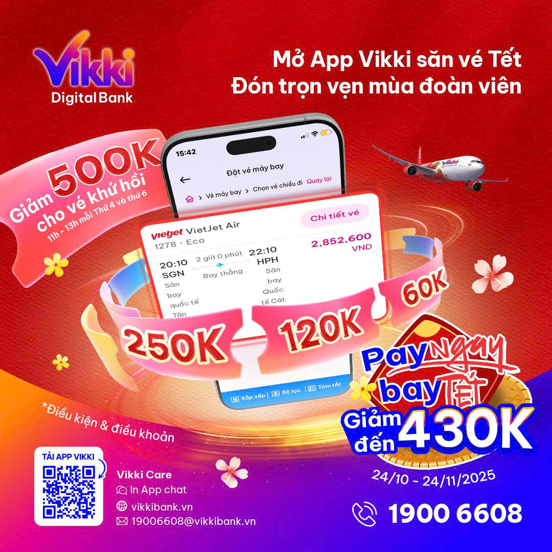 Hiểu được nhu cầu đó, Ngân hàng Số Vikki mang đến ưu đãi siêu hấp dẫn khi đặt vé máy bay Vietjet ngay trên ứng dụng — giải pháp vừa tiện lợi, vừa giúp tối ưu chi phí di chuyển chỉ với vài thao tác. Tết này, chỉ cần mở app Vikki, hành trình sum vầy của bạn sẽ trở nên nhẹ nhàng, trọn vẹn và tiết kiệm hơn bao giờ hết.