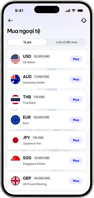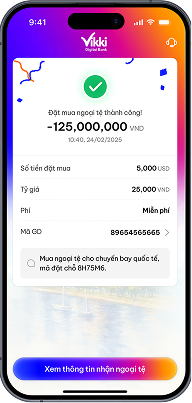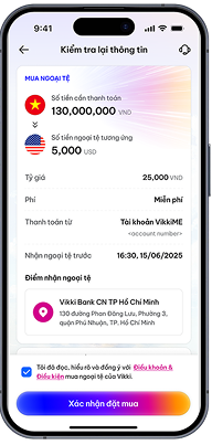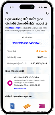 Bạn có thể dễ dàng đặt mua ngoại tệ trực tuyến ngay trên App Vikki – nhanh chóng, linh hoạt và tiện lợi. Ngoại tệ sẽ được nhận trực tiếp tại Điểm giao dịch Vikki Bank mà bạn lựa chọn.