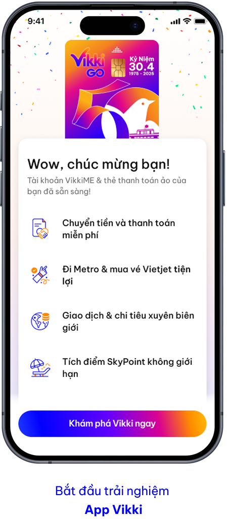 Giới thiệu phong cách mở tài khoản hoàn toàn mới. Giờ đây, chỉ cần xác thực VNeID, bạn sẽ nhanh chóng sở hữu tài khoản VikkiME để tận hưởng mọi dịch vụ Ngân hàng Số & gia nhập xu hướng tài chính hiện đại từ Vikki.