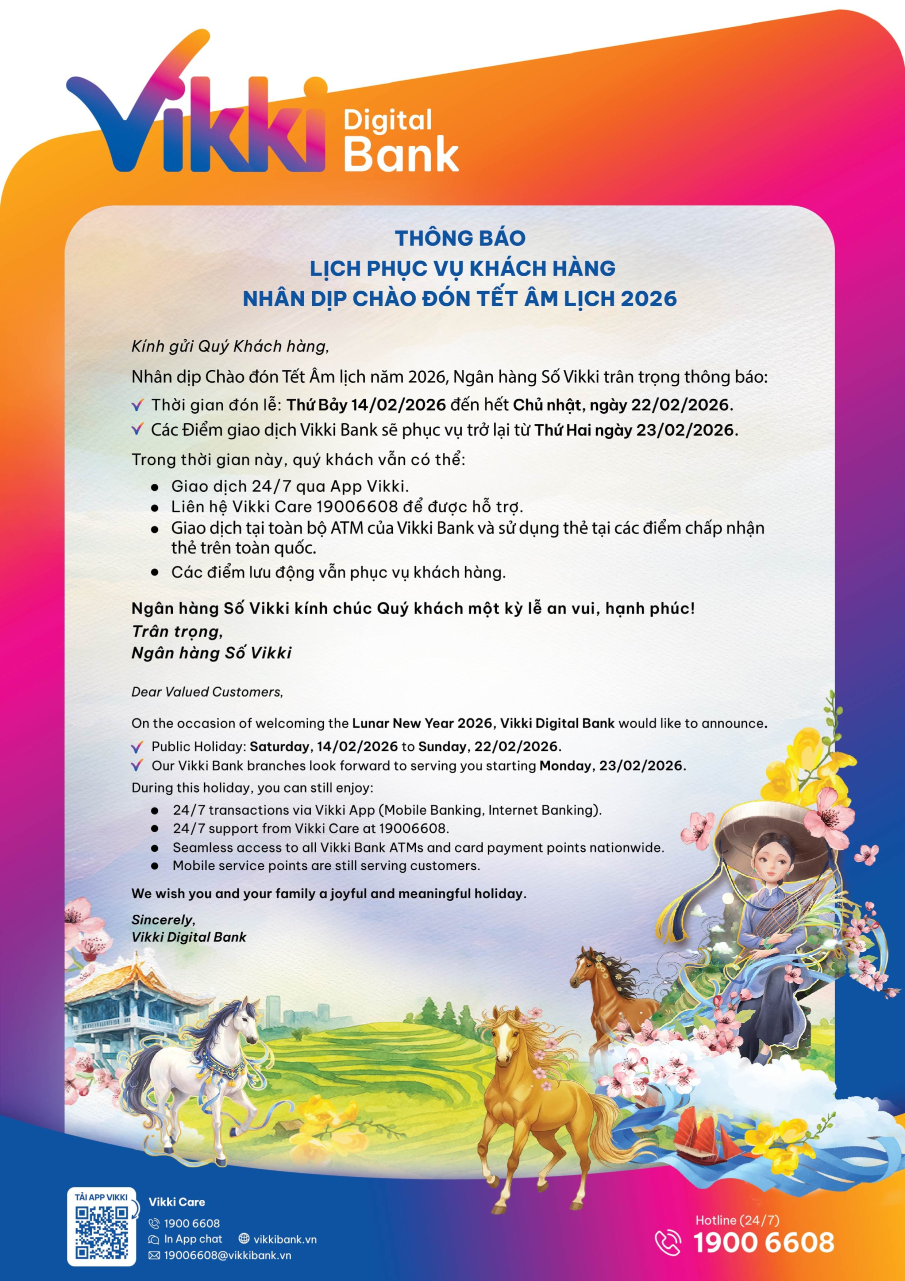 Nhân dịp Chào đón Tết Âm lịch năm 2026, Ngân hàng Số Vikki trân trọng thông báo: