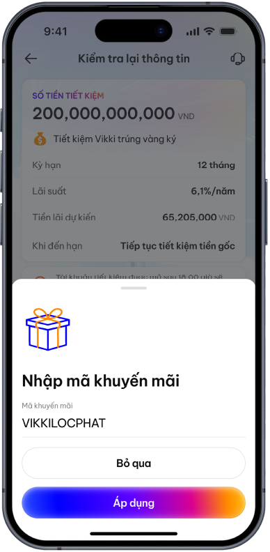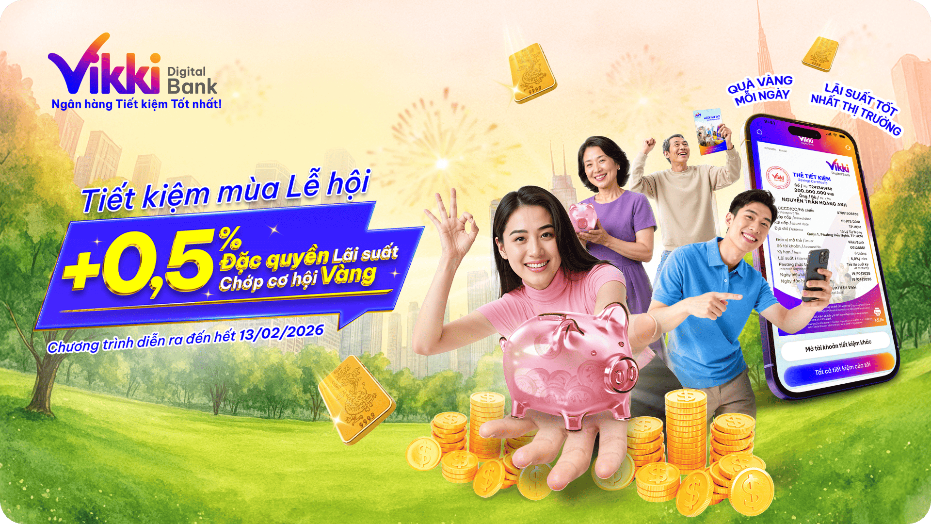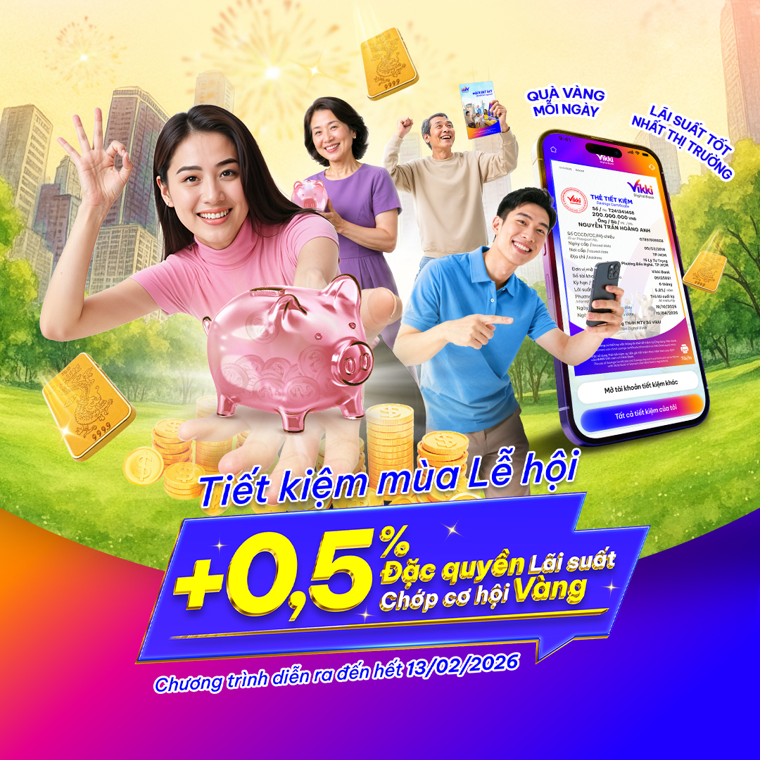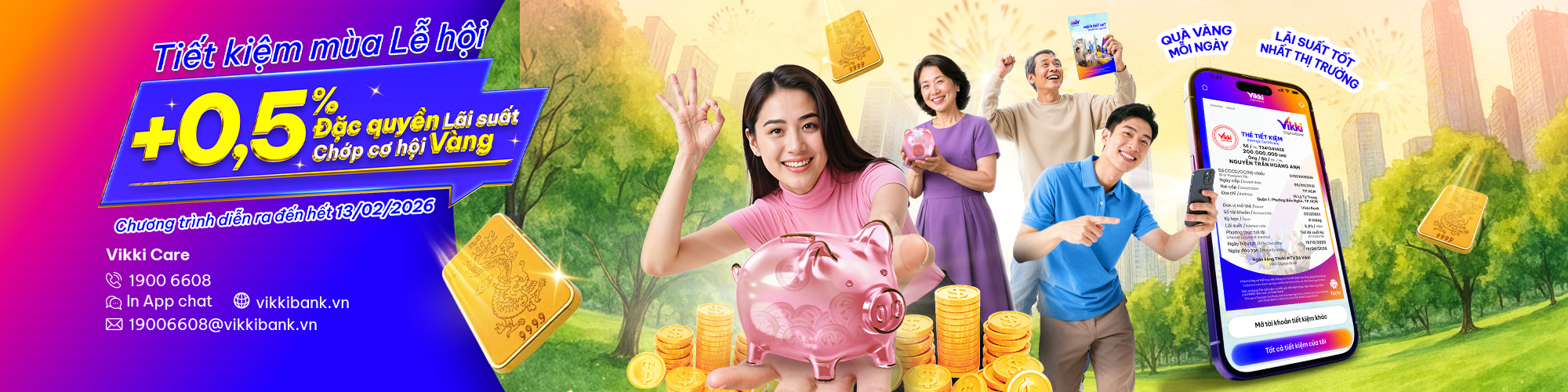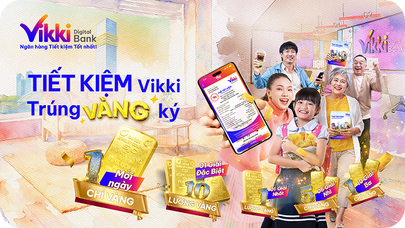 Lãi suất siêu hấp dẫn, gửi tiết kiệm từ 20 triệu đồng trên App Vikki và các Điểm giao dịch trên toàn quốc, cơ hội trúng đến 10 lượng vàng SJC và hơn 180,000 giải thưởng hấp dẫn