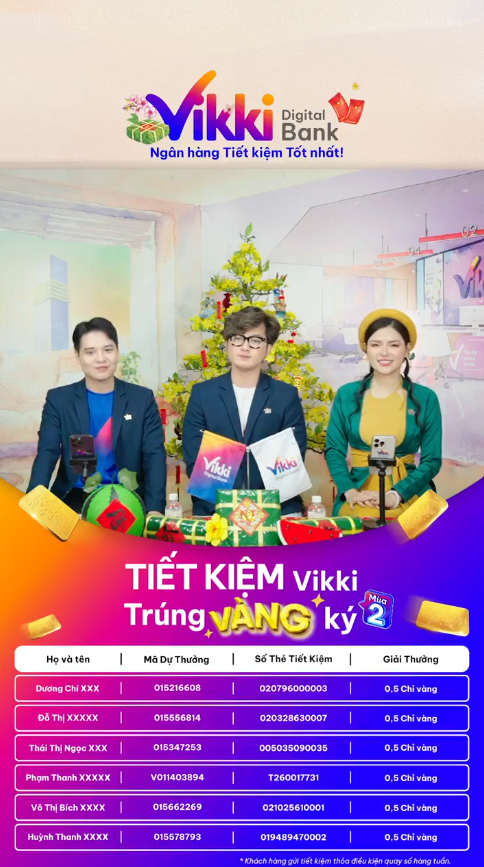 Phiên Megalive, diễn ra vào sáng Thứ Bảy, ngày 17/01/2026. Vikki Bank đã tìm ra 6 khách hàng may mắn sở hữu mã số dự thưởng được cấp trong giai đoạn từ 00:00 ngày 09/01/2026 đến 23:59 ngày 15/01/2026, mỗi khách hàng nhận 0,5 chỉ vàng SJC 999.9. Danh sách trúng thưởng được công bố trực tiếp ngay trong chương trình bao gồm khách hàng: Dương Chí XXX; Đỗ Thị XXXXX; Thái Thị Ngọc XXX; Phạm Thanh XXXXX; Võ Thị Bích XXXX; Huỳnh Thanh XXXX.