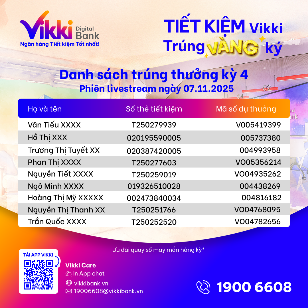 | Tuần 4 | 22/11/2025: xác định 06 giải thưởng tuần cho các MSDT được cấp từ 00:00:00 ngày 14/11/2025 đến 23:59:59 ngày 20/11/2025. Danh sách khách hàng trúng thưởng 0,5 chỉ vàng tại đây |