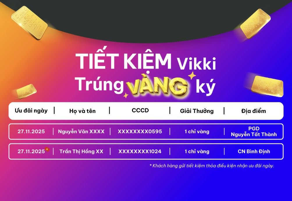 Song song với ưu đãi đặc biệt dành cho Miền Trung – Tây Nguyên, chương trình tổng thể “TIẾT KIỆM Vikki – Trúng VÀNG ký” hiện đang diễn ra tại 212 chi nhánh/phòng giao dịch trên toàn quốc và ngay trên ứng dụng Vikki, với thời gian kéo dài đến hết ngày 10/2/2026. Giải đặc biệt lên đến 10 lượng vàng, dự kiến công bố vào ngày 14/2/2026.
