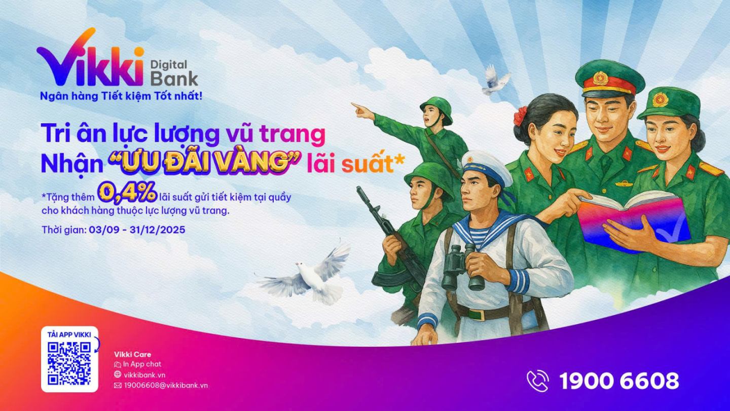 Hà Nội, ngày 03 tháng 9 năm 2025 – Nhân dịp kỷ niệm 80 năm Cách mạng Tháng Tám và Quốc khánh 2/9, Ngân hàng Số Vikki triển khai chương trình ưu đãi đặc biệt dành riêng cho khách hàng thuộc lực lượng vũ trang, với lãi suất tiết kiệm tăng thêm 0,4%/năm cùng nhiều quà tặng tri ân giá trị.