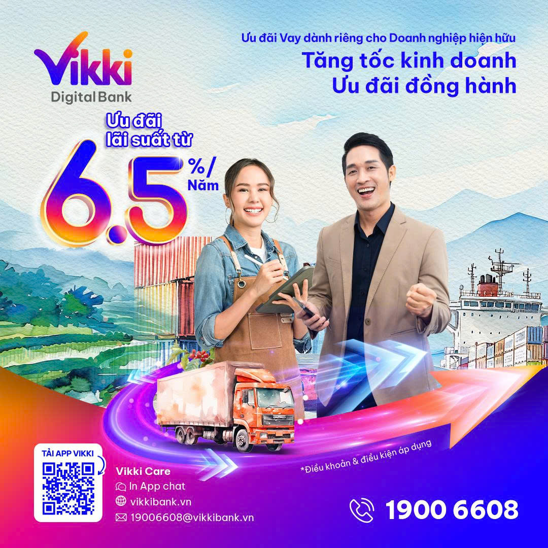 Với mong muốn đồng hành cùng doanh nghiệp trên hành trình phát triển từ nay cho tới 31/12/2025, Ngân hàng Số Vikki sẽ triển khai gói vay dành riêng cho các doanh nghiệp hiện hữu, tiếp sức mùa kinh doanh 6 tháng cuối năm, với lãi suất cực kỳ ưu đãi chỉ từ 6,5%/năm.