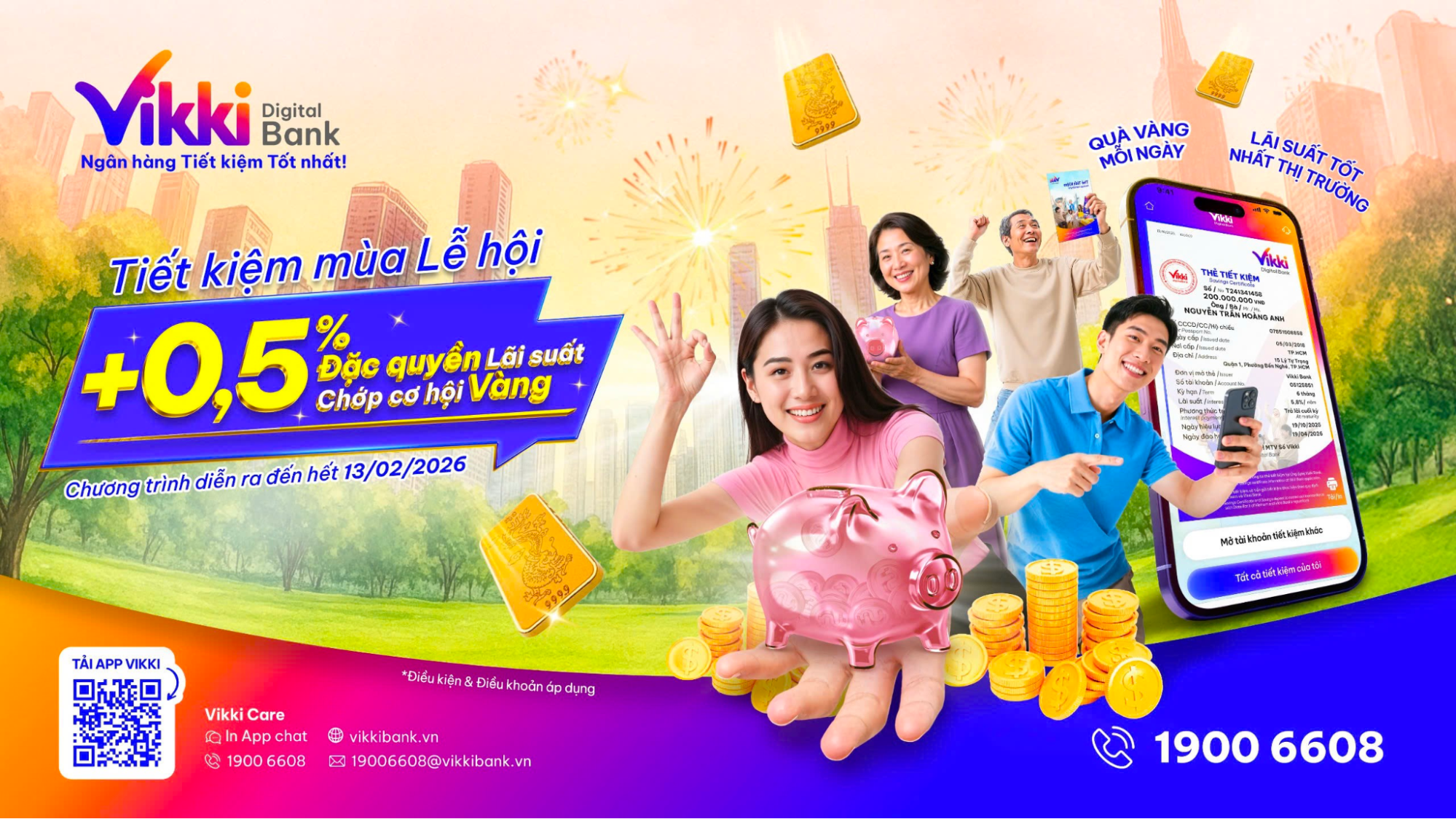 Thông qua chương trình Tiết kiệm mùa Lễ Hội, Vikki mong muốn đồng hành cùng khách hàng tối ưu hóa dòng tiền, gia tăng lợi tức và khởi đầu năm mới với nền tảng tài chính vững vàng.